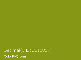 Decimal 14513610807 Color is a normal yellow color and the nearest color is Trendy Green #7c881a. Hex code #869715 and RGB value is rgb(134,151,21). In RGB color space, this color is composed of 53% red, 59% green, 8% blue, In CMYK color space, this color is composed of 11% cyan, 0% magenta, 86% yellow , 41% black , In HSL color space, this color has a hue angle of 68° , 76% saturation and 34% lightness.