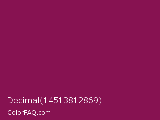 Decimal 14513812869 Color is a dark rose color and the nearest color is Disco #871550. Hex code #871251 and RGB value is rgb(135,18,81). In RGB color space, this color is composed of 53% red, 7% green, 32% blue, In CMYK color space, this color is composed of 0% cyan, 87% magenta, 40% yellow , 47% black , In HSL color space, this color has a hue angle of 328° , 76% saturation and 30% lightness.