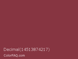 Decimal 14513874217 Color is a normal red color and the nearest color is Solid Pink #893843. Hex code #873541 and RGB value is rgb(135,53,65). In RGB color space, this color is composed of 53% red, 21% green, 25% blue, In CMYK color space, this color is composed of 0% cyan, 61% magenta, 52% yellow , 47% black , In HSL color space, this color has a hue angle of 351° , 44% saturation and 37% lightness.