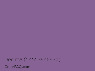 Decimal 14513946930 Color is a normal purple color and the nearest color is Trendy Pink #8c6495. Hex code #876294 and RGB value is rgb(135,98,148). In RGB color space, this color is composed of 53% red, 38% green, 58% blue, In CMYK color space, this color is composed of 9% cyan, 34% magenta, 0% yellow , 42% black , In HSL color space, this color has a hue angle of 284° , 20% saturation and 48% lightness.