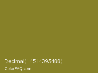 Decimal 14514395488 Color is a normal yellow color and the nearest color is Old Moss Green #867e36. Hex code #878128 and RGB value is rgb(135,129,40). In RGB color space, this color is composed of 53% red, 51% green, 16% blue, In CMYK color space, this color is composed of 0% cyan, 4% magenta, 70% yellow , 47% black , In HSL color space, this color has a hue angle of 56° , 54% saturation and 34% lightness.