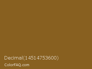 Decimal 14514753600 Color is a normal orange color and the nearest color is Kumera #886221. Hex code #886020 and RGB value is rgb(136,96,32). In RGB color space, this color is composed of 53% red, 38% green, 13% blue, In CMYK color space, this color is composed of 0% cyan, 29% magenta, 76% yellow , 47% black , In HSL color space, this color has a hue angle of 37° , 62% saturation and 33% lightness.