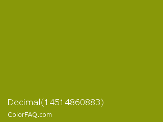 Decimal 14514860883 Color is a normal yellow color and the nearest color is Dark Yellow #9b870c. Hex code #889809 and RGB value is rgb(136,152,9). In RGB color space, this color is composed of 53% red, 60% green, 4% blue, In CMYK color space, this color is composed of 11% cyan, 0% magenta, 94% yellow , 40% black , In HSL color space, this color has a hue angle of 67° , 89% saturation and 32% lightness.