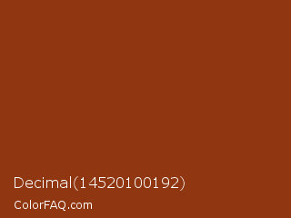 Decimal 14520100192 Color is a normal orange color and the nearest color is Kobe #882d17. Hex code #903610 and RGB value is rgb(144,54,16). In RGB color space, this color is composed of 56% red, 21% green, 6% blue, In CMYK color space, this color is composed of 0% cyan, 63% magenta, 89% yellow , 44% black , In HSL color space, this color has a hue angle of 18° , 80% saturation and 31% lightness.