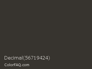 Decimal 56719424 Color is a very dark orange color and the nearest color is Dune #383533. Hex code #373430 and RGB value is rgb(55,52,48). In RGB color space, this color is composed of 22% red, 20% green, 19% blue, In CMYK color space, this color is composed of 0% cyan, 5% magenta, 13% yellow , 78% black , In HSL color space, this color has a hue angle of 34° , 7% saturation and 20% lightness.