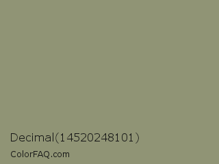 Decimal 14520248101 Color is a normal yellow color and the nearest color is Artichoke #8f9779. Hex code #909475 and RGB value is rgb(144,148,117). In RGB color space, this color is composed of 56% red, 58% green, 46% blue, In CMYK color space, this color is composed of 3% cyan, 0% magenta, 21% yellow , 42% black , In HSL color space, this color has a hue angle of 68° , 13% saturation and 52% lightness.