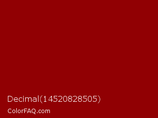 Decimal 14520828505 Color is a dark red color and the nearest color is Red Berry #8e0000. Hex code #910003 and RGB value is rgb(145,0,3). In RGB color space, this color is composed of 57% red, 0% green, 1% blue, In CMYK color space, this color is composed of 0% cyan, 100% magenta, 98% yellow , 43% black , In HSL color space, this color has a hue angle of 359° , 100% saturation and 28% lightness.