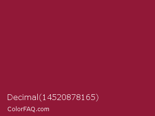 Decimal 14520878165 Color is a normal red color and the nearest color is Vivid Burgundy #9f1d35. Hex code #911837 and RGB value is rgb(145,24,55). In RGB color space, this color is composed of 57% red, 9% green, 22% blue, In CMYK color space, this color is composed of 0% cyan, 83% magenta, 62% yellow , 43% black , In HSL color space, this color has a hue angle of 345° , 72% saturation and 33% lightness.