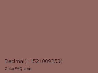 Decimal 14521009253 Color is a normal red color and the nearest color is Dark Chestnut #986960. Hex code #916661 and RGB value is rgb(145,102,97). In RGB color space, this color is composed of 57% red, 40% green, 38% blue, In CMYK color space, this color is composed of 0% cyan, 30% magenta, 33% yellow , 43% black , In HSL color space, this color has a hue angle of 6° , 20% saturation and 47% lightness.