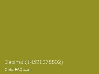 Decimal 14521078802 Color is a normal yellow color and the nearest color is Hacienda #98811b. Hex code #919124 and RGB value is rgb(145,145,36). In RGB color space, this color is composed of 57% red, 57% green, 14% blue, In CMYK color space, this color is composed of 0% cyan, 0% magenta, 75% yellow , 43% black , In HSL color space, this color has a hue angle of 60° , 60% saturation and 35% lightness.