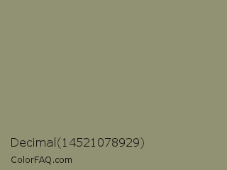 Decimal 14521078929 Color is a normal yellow color and the nearest color is Artichoke #8f9779. Hex code #919173 and RGB value is rgb(145,145,115). In RGB color space, this color is composed of 57% red, 57% green, 45% blue, In CMYK color space, this color is composed of 0% cyan, 0% magenta, 21% yellow , 43% black , In HSL color space, this color has a hue angle of 60° , 12% saturation and 51% lightness.