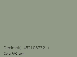 Decimal 14521087321 Color is a normal green color and the nearest color is Mantle #8b9c90. Hex code #919987 and RGB value is rgb(145,153,135). In RGB color space, this color is composed of 57% red, 60% green, 53% blue, In CMYK color space, this color is composed of 5% cyan, 0% magenta, 12% yellow , 40% black , In HSL color space, this color has a hue angle of 87° , 8% saturation and 56% lightness.