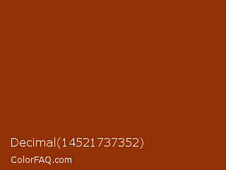 Decimal 14521737352 Color is a dark orange color and the nearest color is Smokey Topaz #832a0d. Hex code #923008 and RGB value is rgb(146,48,8). In RGB color space, this color is composed of 57% red, 19% green, 3% blue, In CMYK color space, this color is composed of 0% cyan, 67% magenta, 95% yellow , 43% black , In HSL color space, this color has a hue angle of 17° , 90% saturation and 30% lightness.