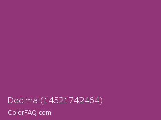 Decimal 14521742464 Color is a normal magenta color and the nearest color is Razzmic Berry Crayola #843179. Hex code #923578 and RGB value is rgb(146,53,120). In RGB color space, this color is composed of 57% red, 21% green, 47% blue, In CMYK color space, this color is composed of 0% cyan, 64% magenta, 18% yellow , 43% black , In HSL color space, this color has a hue angle of 317° , 47% saturation and 39% lightness.