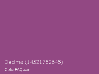 Decimal 14521762645 Color is a normal magenta color and the nearest color is Plum #8e4585. Hex code #924883 and RGB value is rgb(146,72,131). In RGB color space, this color is composed of 57% red, 28% green, 51% blue, In CMYK color space, this color is composed of 0% cyan, 51% magenta, 10% yellow , 43% black , In HSL color space, this color has a hue angle of 312° , 34% saturation and 43% lightness.