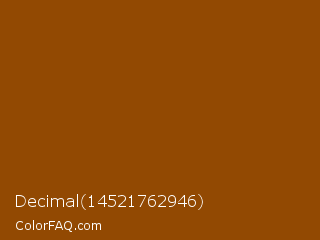 Decimal 14521762946 Color is a dark orange color and the nearest color is Brown #964b00. Hex code #924902 and RGB value is rgb(146,73,2). In RGB color space, this color is composed of 57% red, 29% green, 1% blue, In CMYK color space, this color is composed of 0% cyan, 50% magenta, 99% yellow , 43% black , In HSL color space, this color has a hue angle of 30° , 97% saturation and 29% lightness.