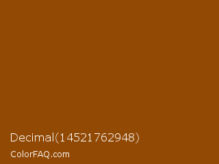 Decimal 14521762948 Color is a dark orange color and the nearest color is Brown #964b00. Hex code #924904 and RGB value is rgb(146,73,4). In RGB color space, this color is composed of 57% red, 29% green, 2% blue, In CMYK color space, this color is composed of 0% cyan, 50% magenta, 97% yellow , 43% black , In HSL color space, this color has a hue angle of 29° , 95% saturation and 29% lightness.