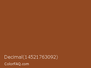 Decimal 14521763092 Color is a normal orange color and the nearest color is Cumin #924321. Hex code #924922 and RGB value is rgb(146,73,34). In RGB color space, this color is composed of 57% red, 29% green, 13% blue, In CMYK color space, this color is composed of 0% cyan, 50% magenta, 77% yellow , 43% black , In HSL color space, this color has a hue angle of 21° , 62% saturation and 35% lightness.