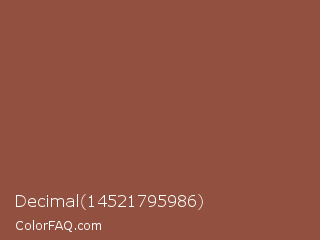 Decimal 14521795986 Color is a normal red color and the nearest color is Coconut #965a3e. Hex code #925140 and RGB value is rgb(146,81,64). In RGB color space, this color is composed of 57% red, 32% green, 25% blue, In CMYK color space, this color is composed of 0% cyan, 45% magenta, 56% yellow , 43% black , In HSL color space, this color has a hue angle of 12° , 39% saturation and 41% lightness.