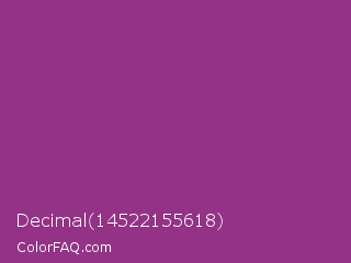 Decimal 14522155618 Color is a normal magenta color and the nearest color is Plum #8e4585. Hex code #933286 and RGB value is rgb(147,50,134). In RGB color space, this color is composed of 58% red, 20% green, 53% blue, In CMYK color space, this color is composed of 0% cyan, 66% magenta, 9% yellow , 42% black , In HSL color space, this color has a hue angle of 308° , 49% saturation and 39% lightness.
