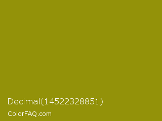 Decimal 14522328851 Color is a normal yellow color and the nearest color is Dark Yellow #9b870c. Hex code #939209 and RGB value is rgb(147,146,9). In RGB color space, this color is composed of 58% red, 57% green, 4% blue, In CMYK color space, this color is composed of 0% cyan, 1% magenta, 94% yellow , 42% black , In HSL color space, this color has a hue angle of 60° , 88% saturation and 31% lightness.
