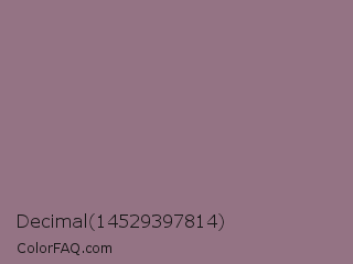 Decimal 14529397814 Color is a normal rose color and the nearest color is Bazaar #98777b. Hex code #947384 and RGB value is rgb(148,115,132). In RGB color space, this color is composed of 58% red, 45% green, 52% blue, In CMYK color space, this color is composed of 0% cyan, 22% magenta, 11% yellow , 42% black , In HSL color space, this color has a hue angle of 329° , 13% saturation and 52% lightness.