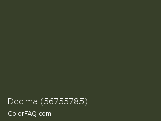 Decimal 56755785 Color is a very dark green color and the nearest color is Kombu Green #354230. Hex code #373f29 and RGB value is rgb(55,63,41). In RGB color space, this color is composed of 22% red, 25% green, 16% blue, In CMYK color space, this color is composed of 13% cyan, 0% magenta, 35% yellow , 75% black , In HSL color space, this color has a hue angle of 82° , 21% saturation and 20% lightness.