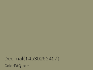 Decimal 14530265417 Color is a normal yellow color and the nearest color is Gurkha #9a9577. Hex code #959375 and RGB value is rgb(149,147,117). In RGB color space, this color is composed of 58% red, 58% green, 46% blue, In CMYK color space, this color is composed of 0% cyan, 1% magenta, 21% yellow , 42% black , In HSL color space, this color has a hue angle of 56° , 13% saturation and 52% lightness.
