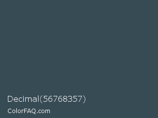 Decimal 56768357 Color is a dark blue color and the nearest color is Limed Spruce #394851. Hex code #374b55 and RGB value is rgb(55,75,85). In RGB color space, this color is composed of 22% red, 29% green, 33% blue, In CMYK color space, this color is composed of 35% cyan, 12% magenta, 0% yellow , 67% black , In HSL color space, this color has a hue angle of 200° , 21% saturation and 27% lightness.