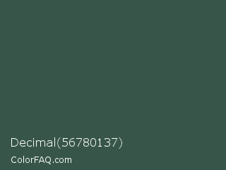 Decimal 56780137 Color is a dark green color and the nearest color is Dark Slate Gray #2f4f4f. Hex code #375649 and RGB value is rgb(55,86,73). In RGB color space, this color is composed of 22% red, 34% green, 29% blue, In CMYK color space, this color is composed of 36% cyan, 0% magenta, 15% yellow , 66% black , In HSL color space, this color has a hue angle of 155° , 22% saturation and 28% lightness.