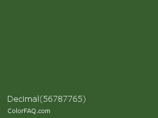 Decimal 56787765 Color is a dark green color and the nearest color is Mughal Green #306030. Hex code #375d2f and RGB value is rgb(55,93,47). In RGB color space, this color is composed of 22% red, 36% green, 18% blue, In CMYK color space, this color is composed of 41% cyan, 0% magenta, 49% yellow , 64% black , In HSL color space, this color has a hue angle of 110° , 33% saturation and 27% lightness.