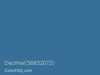 Decimal 56832072 Color is a normal blue color and the nearest color is Calypso #31728d. Hex code #376f98 and RGB value is rgb(55,111,152). In RGB color space, this color is composed of 22% red, 44% green, 60% blue, In CMYK color space, this color is composed of 64% cyan, 27% magenta, 0% yellow , 40% black , In HSL color space, this color has a hue angle of 205° , 47% saturation and 41% lightness.
