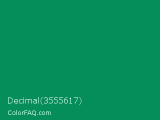 Decimal 3555617 Color is a dark green color and the nearest color is Spanish Green #009150. Hex code #058e59 and RGB value is rgb(5,142,89). In RGB color space, this color is composed of 2% red, 56% green, 35% blue, In CMYK color space, this color is composed of 96% cyan, 0% magenta, 37% yellow , 44% black , In HSL color space, this color has a hue angle of 157° , 93% saturation and 29% lightness.