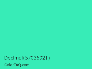Decimal 57036921 Color is a normal green color and the nearest color is Eucalyptus #44d7a8. Hex code #37ecb7 and RGB value is rgb(55,236,183). In RGB color space, this color is composed of 22% red, 93% green, 72% blue, In CMYK color space, this color is composed of 77% cyan, 0% magenta, 22% yellow , 7% black , In HSL color space, this color has a hue angle of 162° , 83% saturation and 57% lightness.