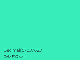 Decimal 57037623 Color is a normal green color and the nearest color is Turquoise #40e0d0. Hex code #37edb9 and RGB value is rgb(55,237,185). In RGB color space, this color is composed of 22% red, 93% green, 73% blue, In CMYK color space, this color is composed of 77% cyan, 0% magenta, 22% yellow , 7% black , In HSL color space, this color has a hue angle of 163° , 83% saturation and 57% lightness.