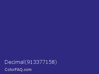 Decimal 913377158 Color is a normal indigo color and the nearest color is Cosmic Cobalt #2e2d88. Hex code #302982 and RGB value is rgb(48,41,130). In RGB color space, this color is composed of 19% red, 16% green, 51% blue, In CMYK color space, this color is composed of 63% cyan, 68% magenta, 0% yellow , 49% black , In HSL color space, this color has a hue angle of 245° , 52% saturation and 34% lightness.