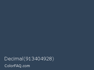 Decimal 913404928 Color is a dark blue color and the nearest color is Pickled Bluewood #314459. Hex code #304358 and RGB value is rgb(48,67,88). In RGB color space, this color is composed of 19% red, 26% green, 35% blue, In CMYK color space, this color is composed of 45% cyan, 24% magenta, 0% yellow , 65% black , In HSL color space, this color has a hue angle of 212° , 29% saturation and 27% lightness.
