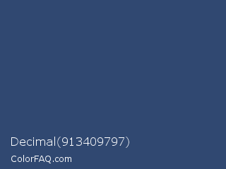 Decimal 913409797 Color is a normal blue color and the nearest color is San Juan #304b6a. Hex code #304871 and RGB value is rgb(48,72,113). In RGB color space, this color is composed of 19% red, 28% green, 44% blue, In CMYK color space, this color is composed of 58% cyan, 36% magenta, 0% yellow , 56% black , In HSL color space, this color has a hue angle of 218° , 40% saturation and 32% lightness.