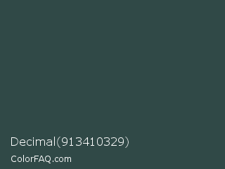 Decimal 913410329 Color is a dark cyan color and the nearest color is Dark Slate Gray #2f4f4f. Hex code #304947 and RGB value is rgb(48,73,71). In RGB color space, this color is composed of 19% red, 29% green, 28% blue, In CMYK color space, this color is composed of 34% cyan, 0% magenta, 3% yellow , 71% black , In HSL color space, this color has a hue angle of 175° , 21% saturation and 24% lightness.