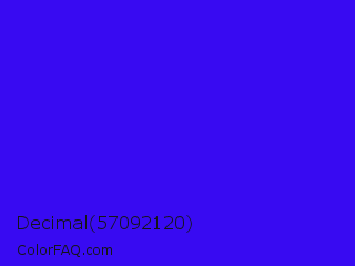 Decimal 57092120 Color is a normal indigo color and the nearest color is Electric Ultramarine #3f00ff. Hex code #380af2 and RGB value is rgb(56,10,242). In RGB color space, this color is composed of 22% red, 4% green, 95% blue, In CMYK color space, this color is composed of 77% cyan, 96% magenta, 0% yellow , 5% black , In HSL color space, this color has a hue angle of 252° , 92% saturation and 49% lightness.