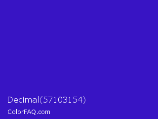 Decimal 57103154 Color is a normal indigo color and the nearest color is Interdimensional Blue #360ccc. Hex code #3814c4 and RGB value is rgb(56,20,196). In RGB color space, this color is composed of 22% red, 8% green, 77% blue, In CMYK color space, this color is composed of 71% cyan, 90% magenta, 0% yellow , 23% black , In HSL color space, this color has a hue angle of 252° , 81% saturation and 42% lightness.