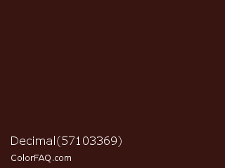 Decimal 57103369 Color is a very dark red color and the nearest color is Dark Sienna #3c1414. Hex code #381511 and RGB value is rgb(56,21,17). In RGB color space, this color is composed of 22% red, 8% green, 7% blue, In CMYK color space, this color is composed of 0% cyan, 63% magenta, 70% yellow , 78% black , In HSL color space, this color has a hue angle of 6° , 53% saturation and 14% lightness.