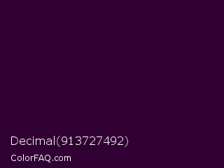 Decimal 913727492 Color is a very dark magenta color and the nearest color is Mardi Gras #350036. Hex code #310134 and RGB value is rgb(49,1,52). In RGB color space, this color is composed of 19% red, 0% green, 20% blue, In CMYK color space, this color is composed of 6% cyan, 98% magenta, 0% yellow , 80% black , In HSL color space, this color has a hue angle of 296° , 96% saturation and 10% lightness.