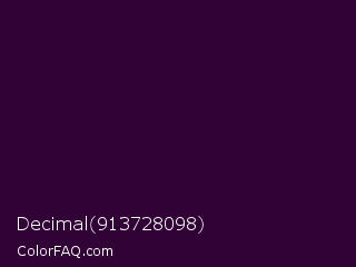 Decimal 913728098 Color is a very dark magenta color and the nearest color is Mardi Gras #350036. Hex code #310236 and RGB value is rgb(49,2,54). In RGB color space, this color is composed of 19% red, 1% green, 21% blue, In CMYK color space, this color is composed of 9% cyan, 96% magenta, 0% yellow , 79% black , In HSL color space, this color has a hue angle of 294° , 93% saturation and 11% lightness.