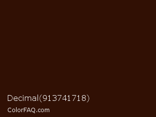 Decimal 913741718 Color is a very dark orange color and the nearest color is Zinnwaldite Brown #2c1608. Hex code #311004 and RGB value is rgb(49,16,4). In RGB color space, this color is composed of 19% red, 6% green, 2% blue, In CMYK color space, this color is composed of 0% cyan, 67% magenta, 92% yellow , 81% black , In HSL color space, this color has a hue angle of 16° , 85% saturation and 10% lightness.