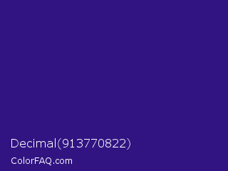 Decimal 913770822 Color is a dark indigo color and the nearest color is Persian Indigo #32127a. Hex code #311482 and RGB value is rgb(49,20,130). In RGB color space, this color is composed of 19% red, 8% green, 51% blue, In CMYK color space, this color is composed of 62% cyan, 85% magenta, 0% yellow , 49% black , In HSL color space, this color has a hue angle of 256° , 73% saturation and 29% lightness.