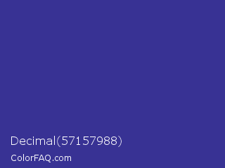 Decimal 57157988 Color is a normal indigo color and the nearest color is Blue Pigment #333399. Hex code #383294 and RGB value is rgb(56,50,148). In RGB color space, this color is composed of 22% red, 20% green, 58% blue, In CMYK color space, this color is composed of 62% cyan, 66% magenta, 0% yellow , 42% black , In HSL color space, this color has a hue angle of 244° , 49% saturation and 39% lightness.
