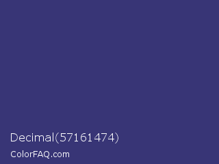Decimal 57161474 Color is a normal indigo color and the nearest color is Minsk #3f307f. Hex code #383576 and RGB value is rgb(56,53,118). In RGB color space, this color is composed of 22% red, 21% green, 46% blue, In CMYK color space, this color is composed of 53% cyan, 55% magenta, 0% yellow , 54% black , In HSL color space, this color has a hue angle of 243° , 38% saturation and 34% lightness.