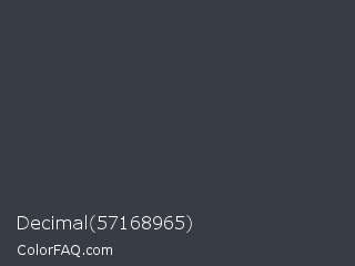 Decimal 57168965 Color is a dark blue color and the nearest color is Ship Gray #3e3a44. Hex code #383c45 and RGB value is rgb(56,60,69). In RGB color space, this color is composed of 22% red, 24% green, 27% blue, In CMYK color space, this color is composed of 19% cyan, 13% magenta, 0% yellow , 73% black , In HSL color space, this color has a hue angle of 222° , 10% saturation and 25% lightness.