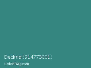 Decimal 914773001 Color is a normal cyan color and the nearest color is Celadon Green #2f847c. Hex code #328581 and RGB value is rgb(50,133,129). In RGB color space, this color is composed of 20% red, 52% green, 51% blue, In CMYK color space, this color is composed of 62% cyan, 0% magenta, 3% yellow , 48% black , In HSL color space, this color has a hue angle of 177° , 45% saturation and 36% lightness.